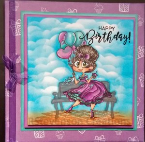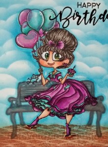 Kraftin Kimmie Stamps – Birthday Bianca (Stamped using Memento – Tuxedo Black onto Copic Marker X-Press It Blending Card) Coloured in with Copic Markers.