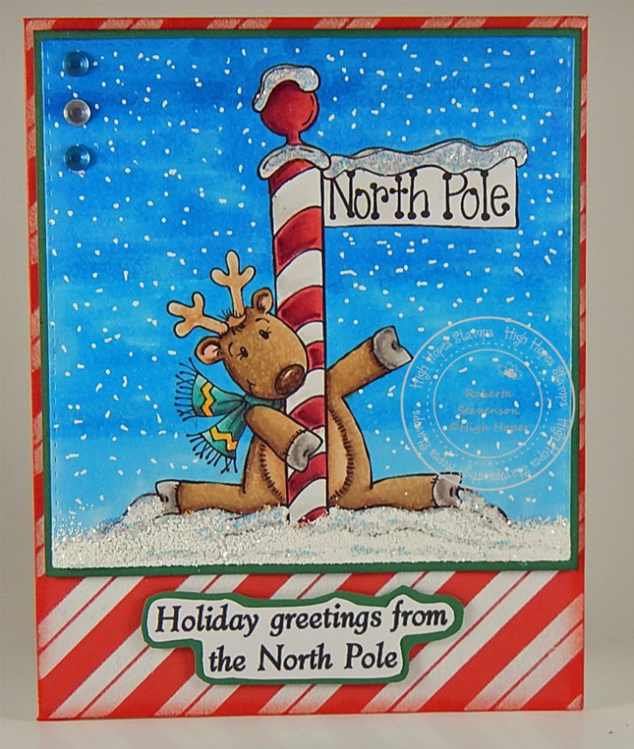 It’s Wednesday, and this month at High Hopes Rubber Stamps we are celebrating Christmas starting off with a brand new release. YAY!!! This week, I used North Pole Reindeer (High Hopes Rubber Stamps) and North Pole Greetings (High Hopes Rubber Stamps) for the sentiment.