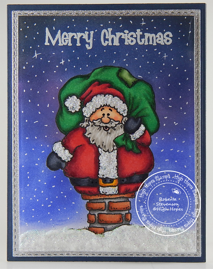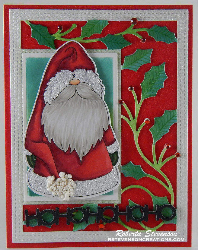 I decided to colour this Santa in non-traditional colours. To make the card, I printed out the main image onto Copic Marker X-Press It Blending Card using my HP Printer. I used my Brother Scan and Cut to cut around the image and coloured it in with Copic markers. Then I applied Nuvo Glitter Accents – Fresh Snowfall to the all of the trimming and set it aside to dry.
