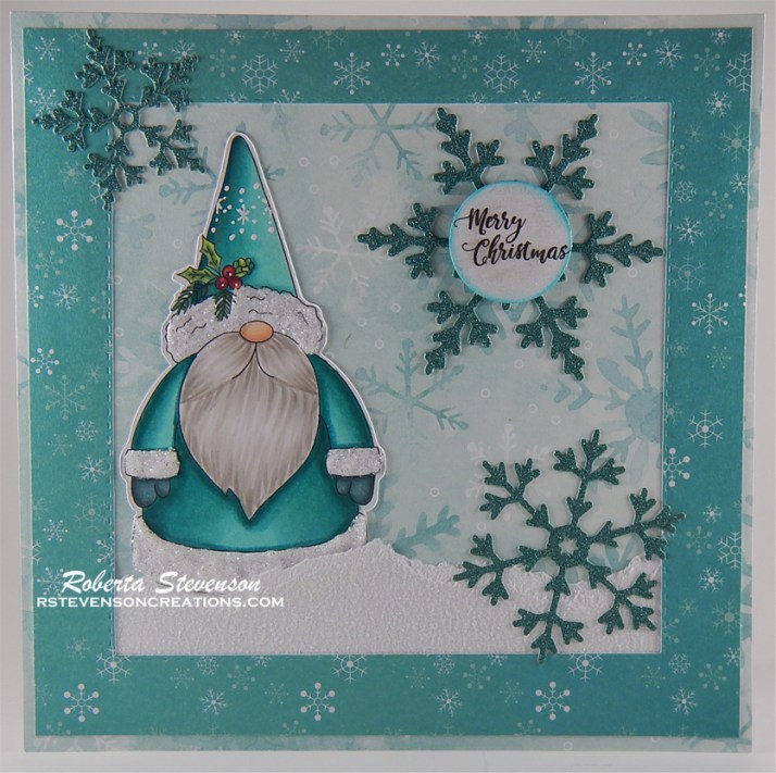 The remainder of the card was now ready to put together. I glued the Gnome directly to the background paper and moved it slightly under the snow. I added glue to each of the snowflakes and placed them directly onto the backgrounds. Lastly, I popped up the sentiment with 3M VHB – 2 sided tape.