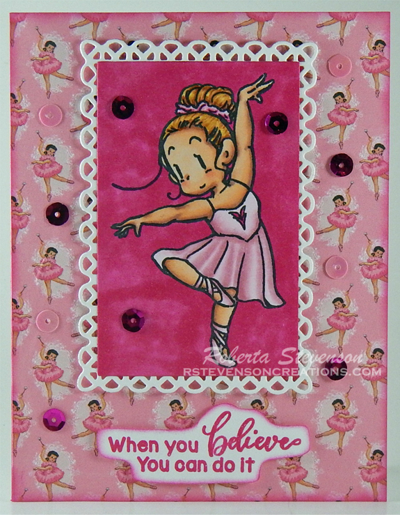 To make the card, I first imported the image and sentiment into Microsoft Word. I sized both the image and sentiment to fit 5″ x 3.6″ and printed everything out onto Copic Marker X-Press It Blending Card using my HP Printer. The image was coloured in with Copic markers. I had a few issues with her hair using my markers, so I used PrismaColor pencils to try and fix it. For the shadow behind the girl, I just used the same 2 markers several times on the background wall. I die cut some pink cardstock using Your Next Stamp – Stitched Rectangle Die Set and then inked around the edges using Tim Holtz Distress Ink – Picked Raspberry.