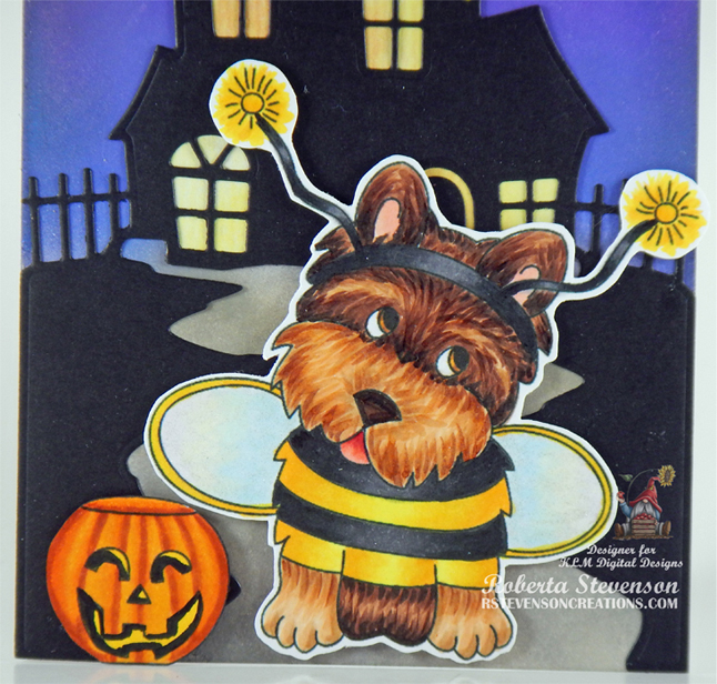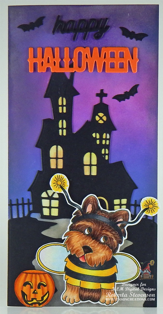 Sharing a Hallowe’en slim line card I made today using KLM Digital DesignFido – Hallowe’en Freebie from the new October 2022 release.  Fido is all set for Trick or Treating with his little “Bee” outfit. Do you dress up your pets for Hallowe’en too?