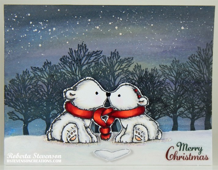 With Memento – Tuxedo Black ink and my MISTI, I stamped the image onto Copic Marker X-Press It Blending Card. I coloured in the image with Copic markers listed below. The image was fussy cut, leaving a touch of white all around it. Using a Sakura Glaze – Black pen, I coloured in the eyes and beaks. Then I added a little dot on the eyes with a Gelly Roll Sakura #5 Pen. Spectrum Noir – Sparkles – Crystal Clear was applied to the hats brims and pom-poms to add a little bit of glitter.