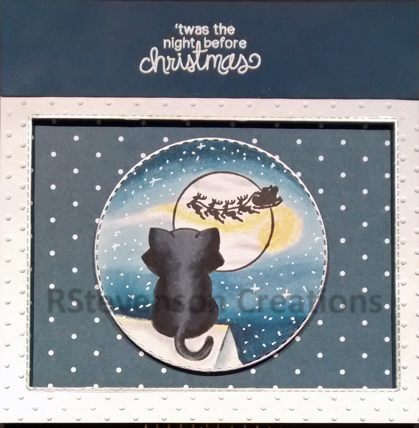 Using my MISTI and Memento – Tuxedo Black ink, I stamped the image onto Copic Marker X-Press It Blending Card cardstock and the sentiment onto Recollections – White cardstock. I coloured in the image with Copic markers and then added some Stickles – Diamond to the parts of the snow to make it sparkly. Gelly Roll Sakura #5 Pen was used to create a starry night sky. I added U-line double-sided tape to the completed image and popped it up onto the card. The sentiment was die cut using my Cuttlebug and Poppystamps – Christmas Quotes. I inked around the edges with Tim Holtz Distress Ink – Chipped Sapphire and glued it onto the top of the image at an angle to complete the card.