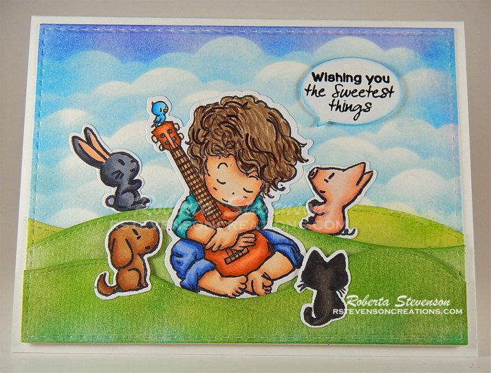 The image was coloured in with Copic Markers listed below and the snow in the sky was applied with a Gelly Roll Sakura #10 Pen. This pen was also applied to the Moose’s eyes. Sakura Glaze – Black pen was applied to the eyes of all of the characters and also to the dog’s nose. UNIPosca PC-3M White marker was applied to the snow in spots to give it a little more texture. U-Line double-sided foam tape was applied to the back of the die cut and sentiment and they were both popped up onto the card.