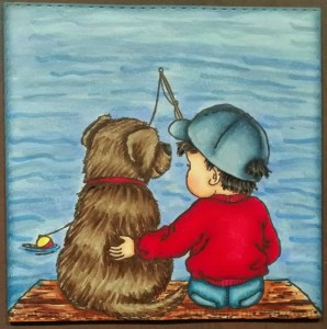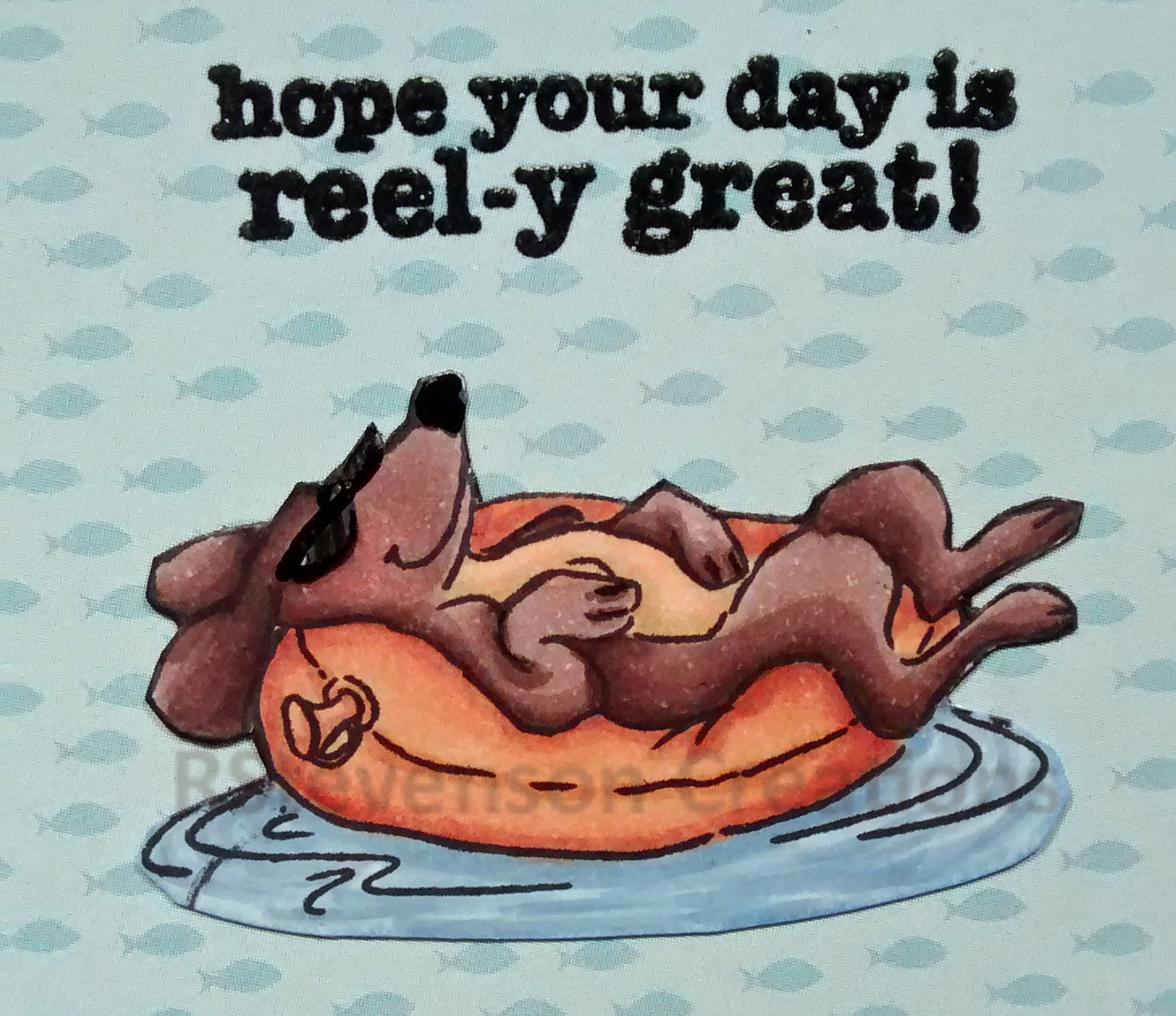 On the front I used a stamp from Whimsy Stamps called “Fishin’ Friends” from the Crissy Armstrong Collection.