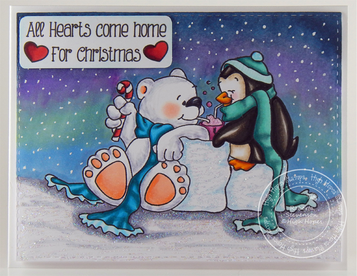 The image was coloured in with Copic markers. I popped up the image and applied it to to the card using 3M double sided tape. I added snow to the bottom of the snowman using Stickles – Diamond to add texture. The snowy background was created with a Ranger – Emboss It Pen Clear and the sentiment was stamped with Versamark ink. Ranger Embossing Powder White – Extra Fine Detail was applied and heat embossed using Marvy Uchida – Embossing Heat Tool. I fussy cut around the sentiment and it was popped up using 3M double-sided tape onto the card to finish it off.