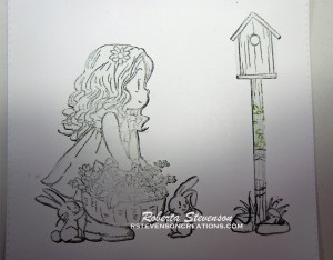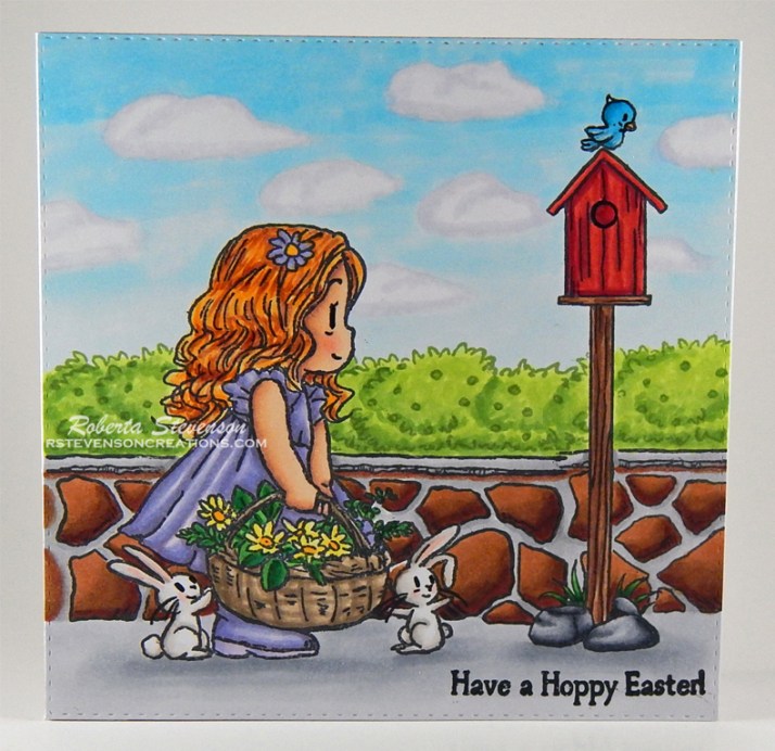 I made this card in stages. First I die-cut a 5″ x 5″ square out of Copic Marker X-Press It Blending Card using my Cuttlebug and My Creative Time – Stitched Squares Inside and Out. Then I stamped all of the images onto Inkadoo Stamping Mask Paper. Using Memento – Tuxedo Black ink and my MISTI, I stamped the Girl, bunnies and Bird House first. Then added the mask over top of them.
