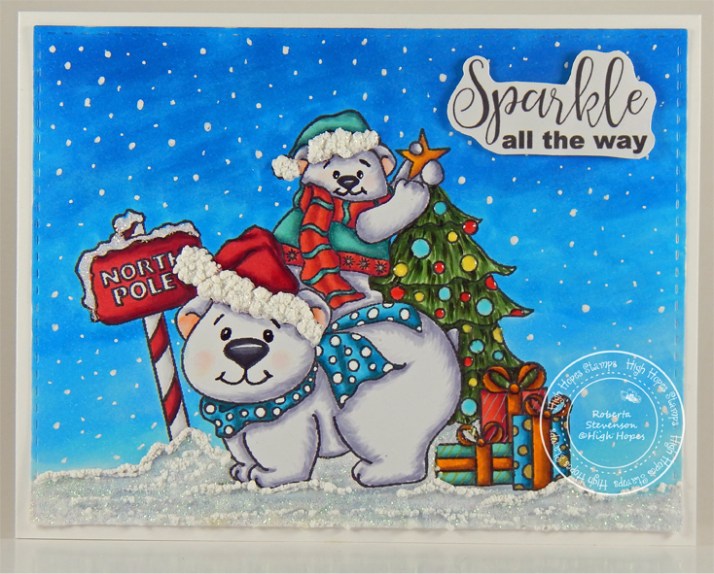 The image was stamped onto the smaller rectangle using my MISTI – Most Incredible Stamping Tool and Memento – Tuxedo Black ink. I coloured in the image and then with a paint brush and a small mixture of DecoArt Glamour Dust, FolkArt – Extreme Glitter Acrylic Paint and Delta Ceramcoat – White, I added in the first layer of snow. A little more DecoArt Glamour Dust was added to it while it was still wet. This dried pretty quickly and Cosmic Shimmer Fluffy Stuff and more glitter were added to give the snow some texture. I also added this to the hat, pompom and sign. Lastly, I added some Crystal – Stickles because you can never have enough glitter. LOL! Wink of Stella – Clear was added to the bows, side of the ball on the pole and down the entire pole. Pental Sunburst Metalic Med Gel Pen – Gold and Wink of Stella – Clear were added to the pink present dots. Once everything was dry, I stamped the sentiment using my MISTI and VersaMark ink. Ranger Embossing Powder White – Extra Fine Detail was applied over top of the ink and then heat embossed with Marvy Uchida – Embossing Heat Tool. The snow in the sky was created using a Gelly Roll Sakura #10 Pen. I applied U-Line double-sided tape to the back of the image and popped it up on top of the larger rectangle. To complete my card, I added in 4 YNS – Holly Jolly Sparkly Gumdrops in the corners.