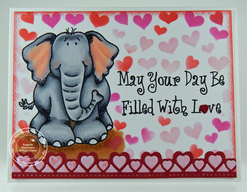 It’s Wednesday, and I’m back this week to start off April with lots and lots of love from Elmer the Elephant using Elmer Elephant – Q043 (High Hopes Rubber Stamps) for the main image and Large Filled With Love – H004 (High Hopes Rubber Stamps) for the sentiment. With everything happening in the world right now, I think we could all use a little bit of love. When I was a child, Elmer was also called Elmer the Safety Elephant, so I hope that you and all of your loved ones are keeping safe right now too!