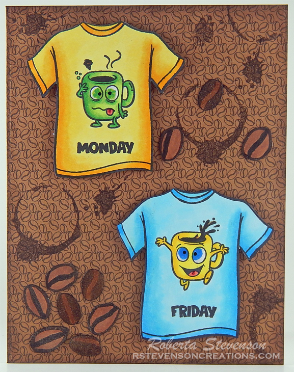 The image was coloured with copic markers. I kept this fun card simple as the expressions on the cups say everything there is to say. LOL! I chose green shades for the Monday T-Shirt, because after the weekend, it’s always a little rough and you feel blah! Friday, is bright and sunny because, hey! Who doesn’t love the weekend????